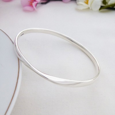 The Trixie Extra Small Silver Bangle is a solid 925 sterling silver bangle featuring a funky, contemporary twist in its design.